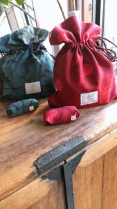 お客様から、「きれいに柄が入ってるからずっと見ていられる」と言って頂いたのですが、やはり、巾着にしたとき、どこを取ればきれいに見えるか、場所を選んで贅沢に裁断しています。